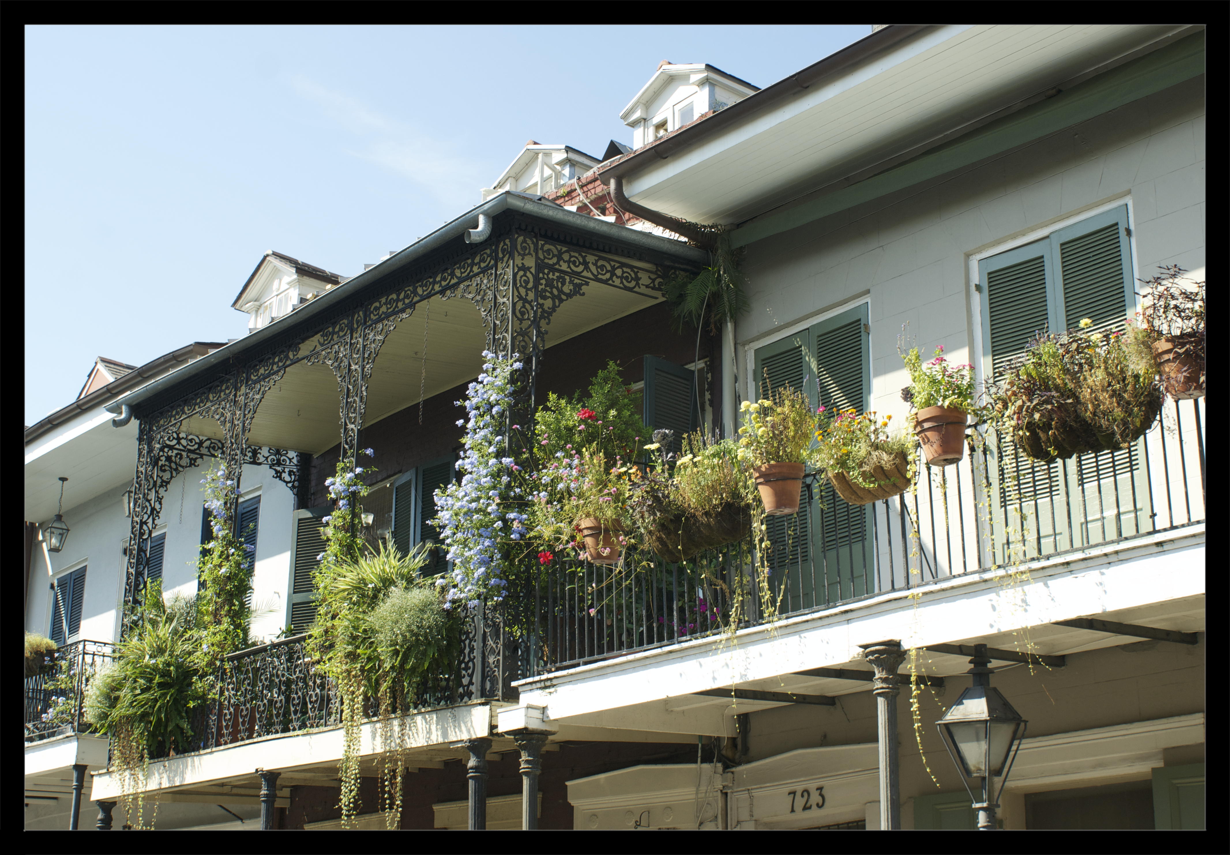 Bourbon Street was very interesting and amusing. The buildings were gorgeous; cladded wood, ornate iron and huge solid doors…just what I imagine a small French town to be like. The residents had taken advantage of their balconies and had a range of items overflowing.